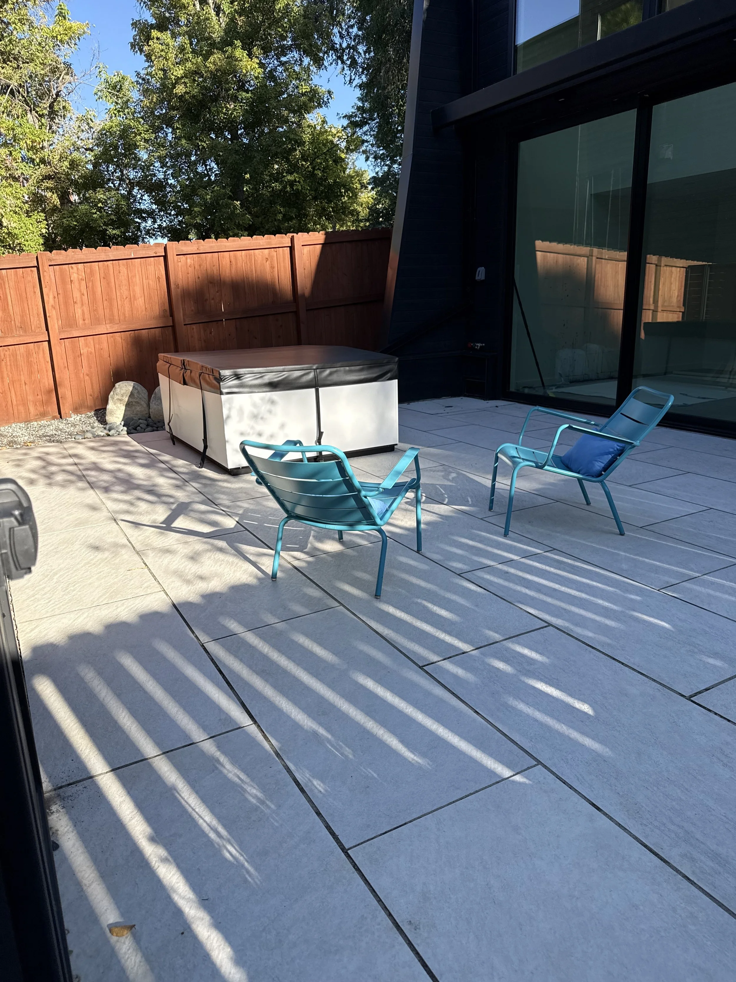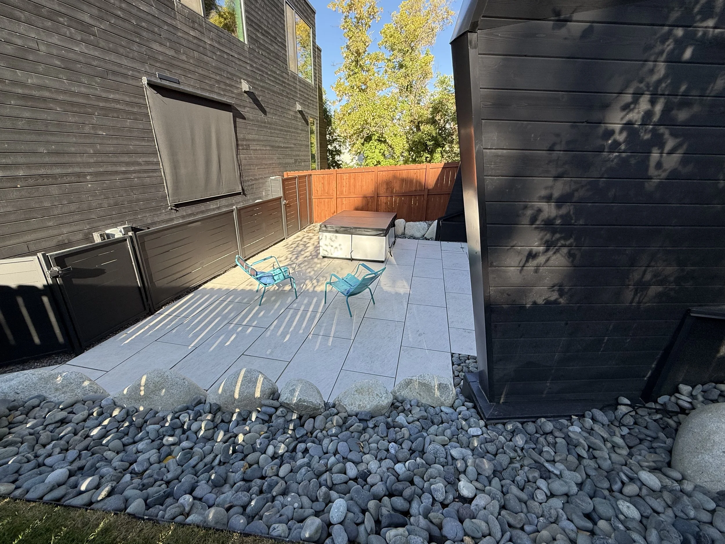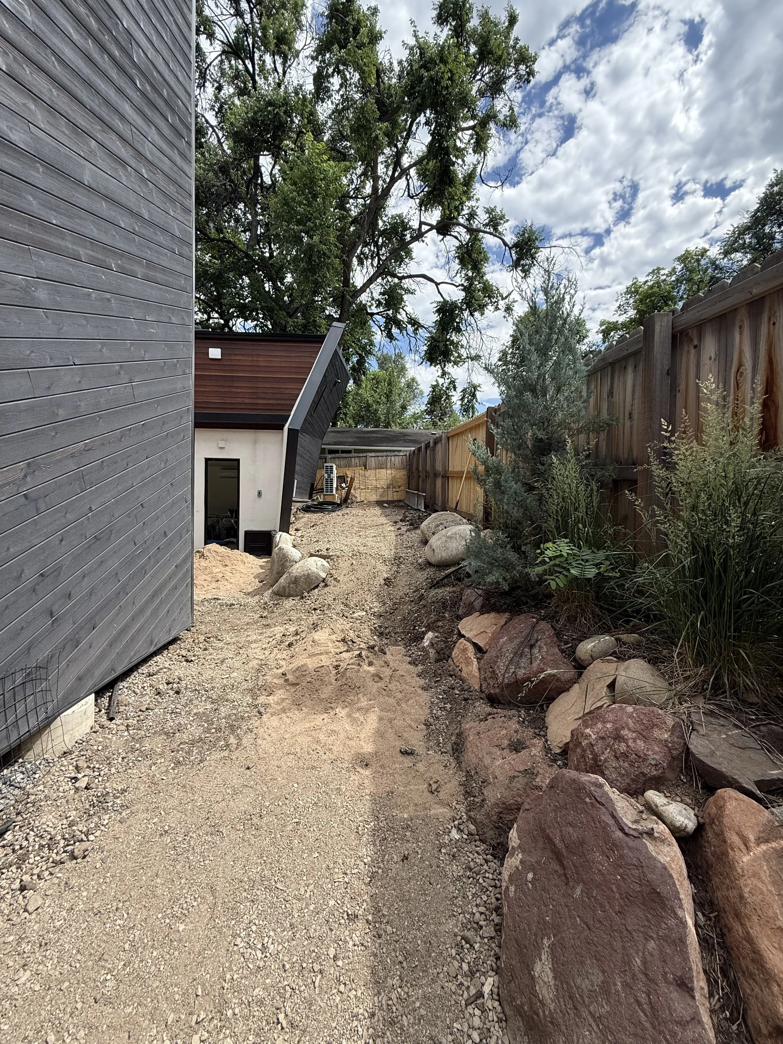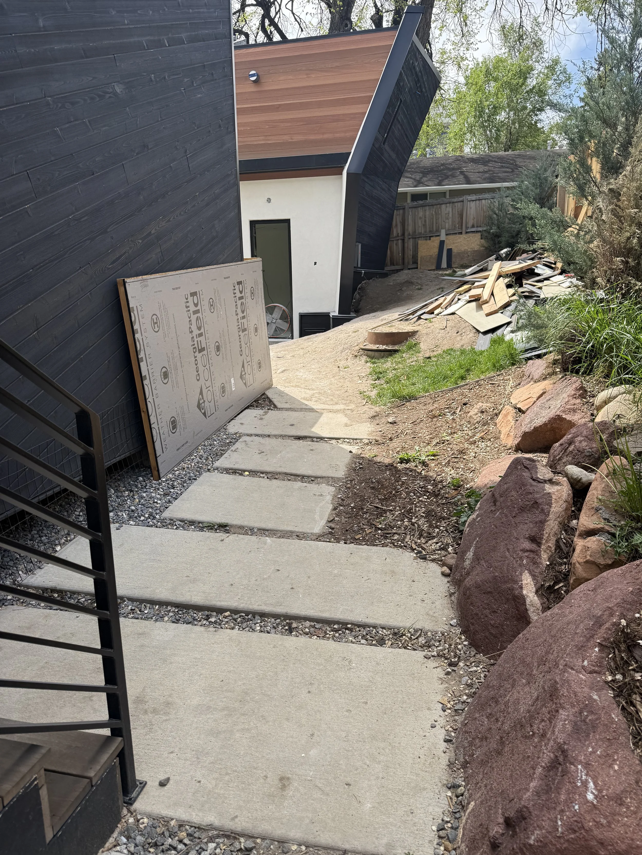 After meeting with both clients, I understood what they desired for their outdoor space: proper drainage, grading, retention, a smooth walkway, patio, hot tub, and minimalist plantings all in a design that would match that of the modern townhouse and ADU. With this understanding, I set upon the research phase of the design process. I reviewed the building permit, landscape codes, and met with the civil engineer who constructed the drainage plan to verify that my design would adhere. I also met with all installers (GC, steel fabricator, landscaper) to verify feasibility of installation. When I design it is first function, then form. I simply won’t design something that is impossible to install or out of alignment with the budget. To me, to do so is unproductive waste of time, energy and money.