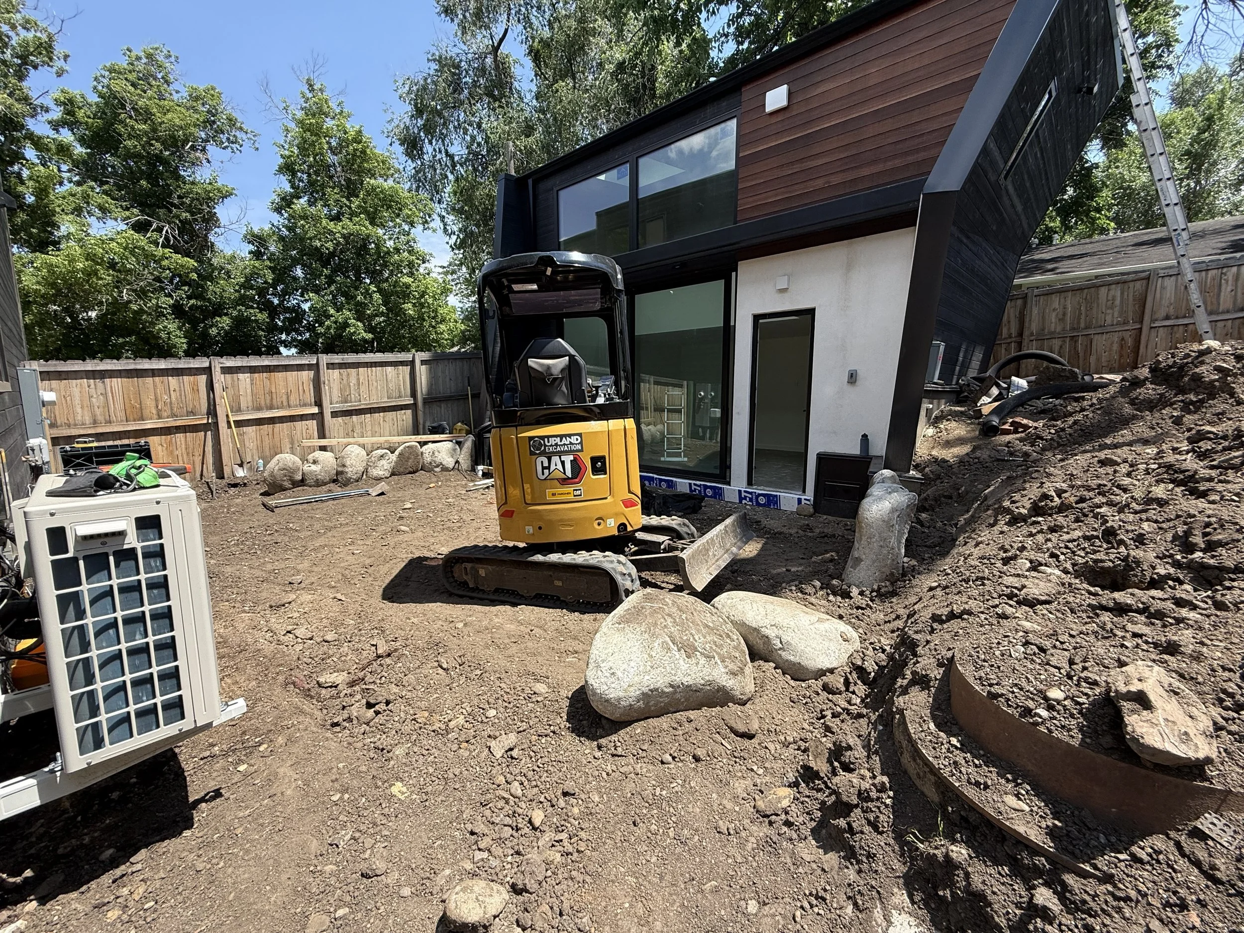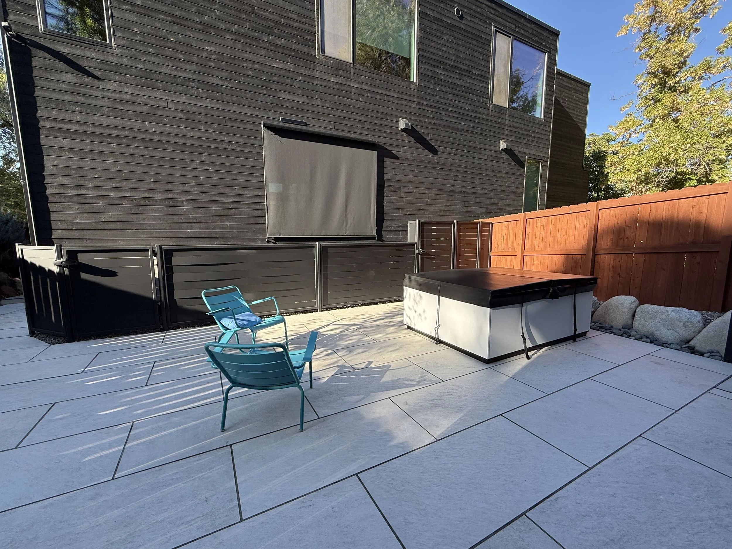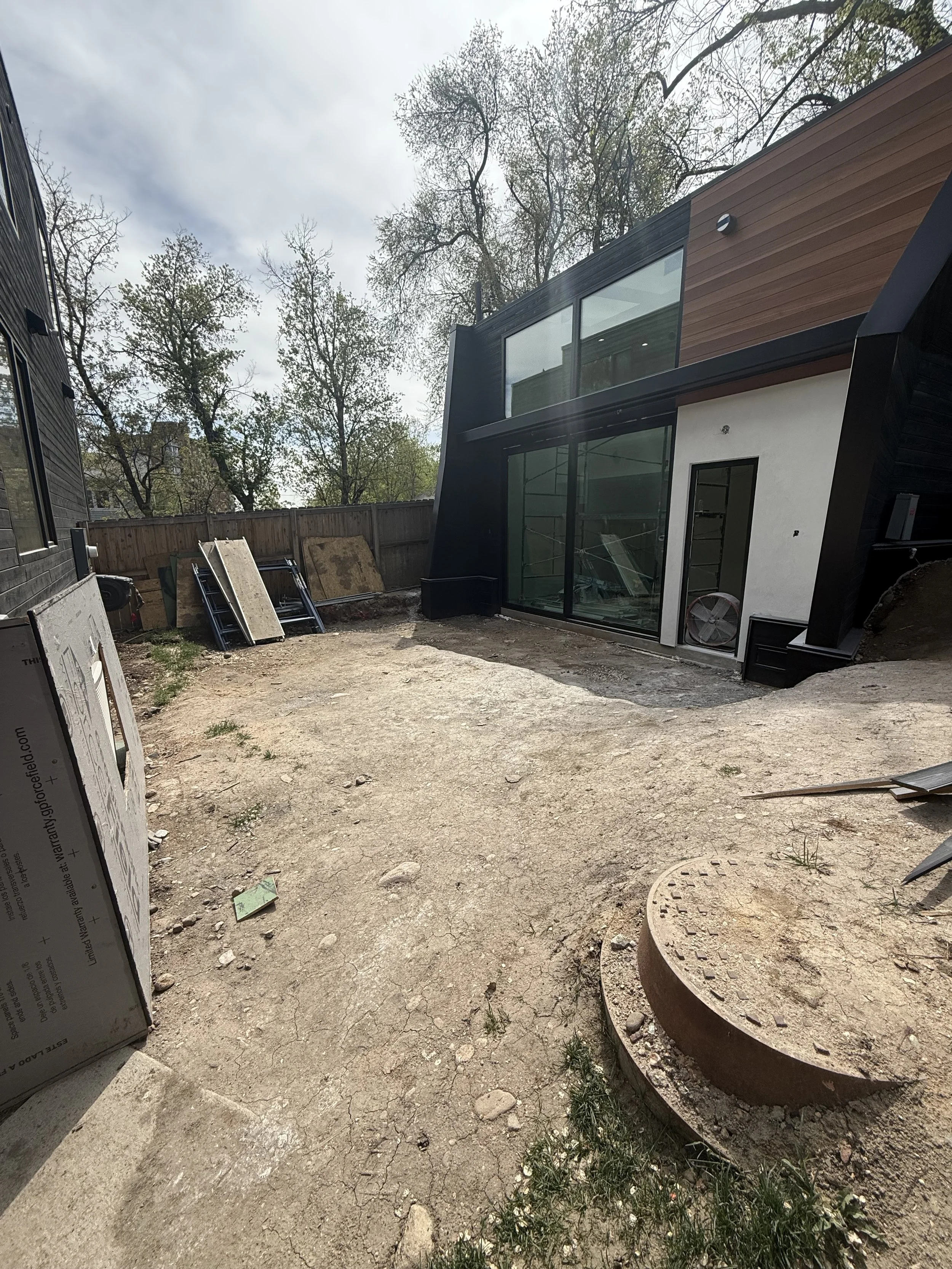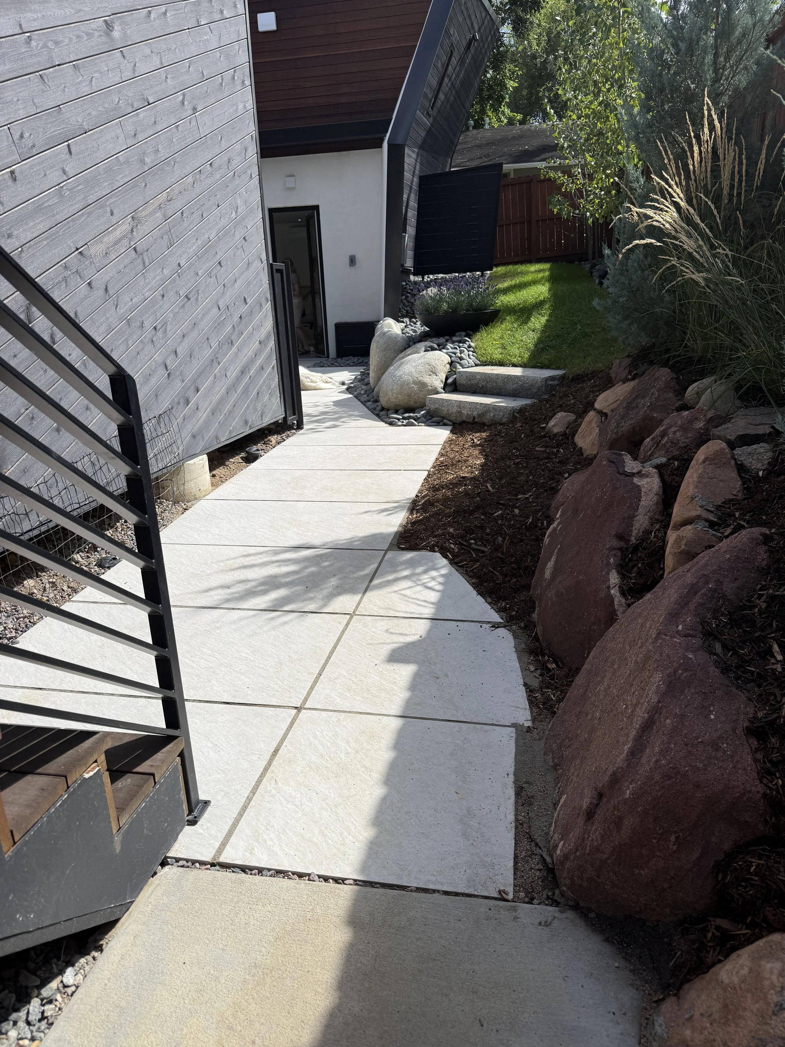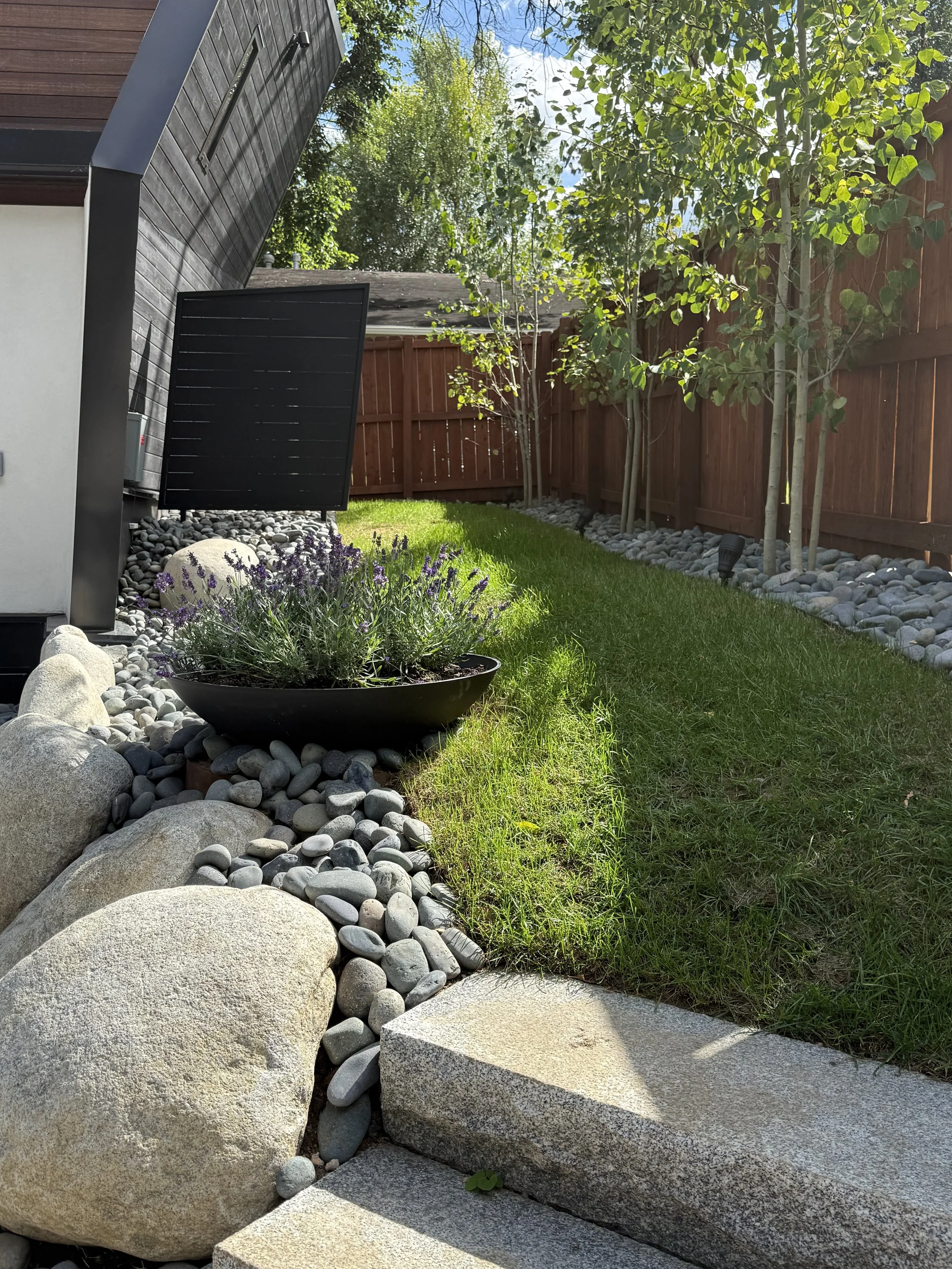 After meeting with both clients, I understood what they desired for their outdoor space: proper drainage, grading, retention, a smooth walkway, patio, hot tub, and minimalist plantings all in a design that would match that of the modern townhouse and ADU. With this understanding, I set upon the research phase of the design process. I reviewed the building permit, landscape codes, and met with the civil engineer who constructed the drainage plan to verify that my design would adhere. I also met with all installers (GC, steel fabricator, landscaper) to verify feasibility of installation. When I design it is first function, then form. I simply won’t design something that is impossible to install or out of alignment with the budget. To me, to do so is unproductive waste of time, energy and money.