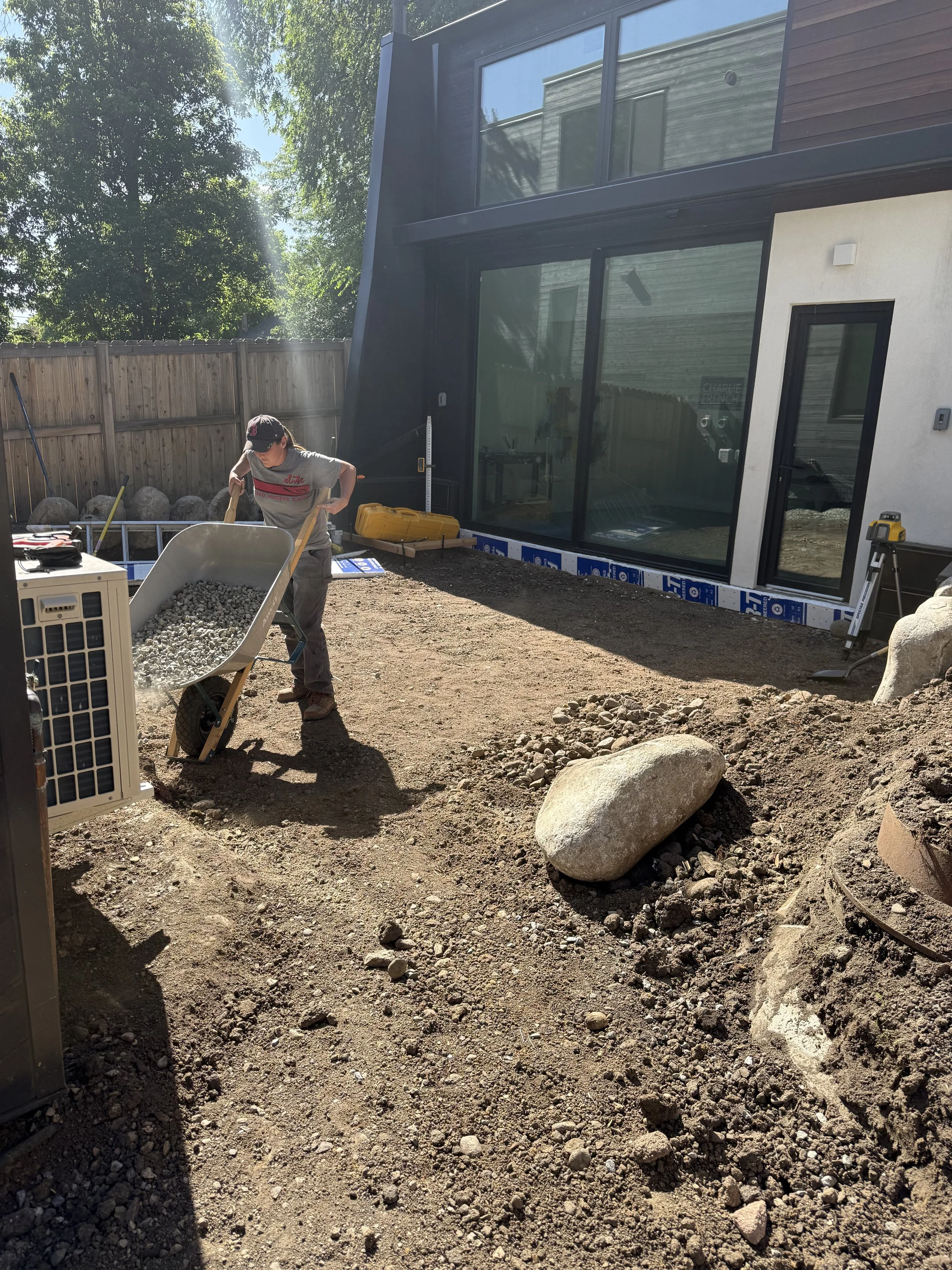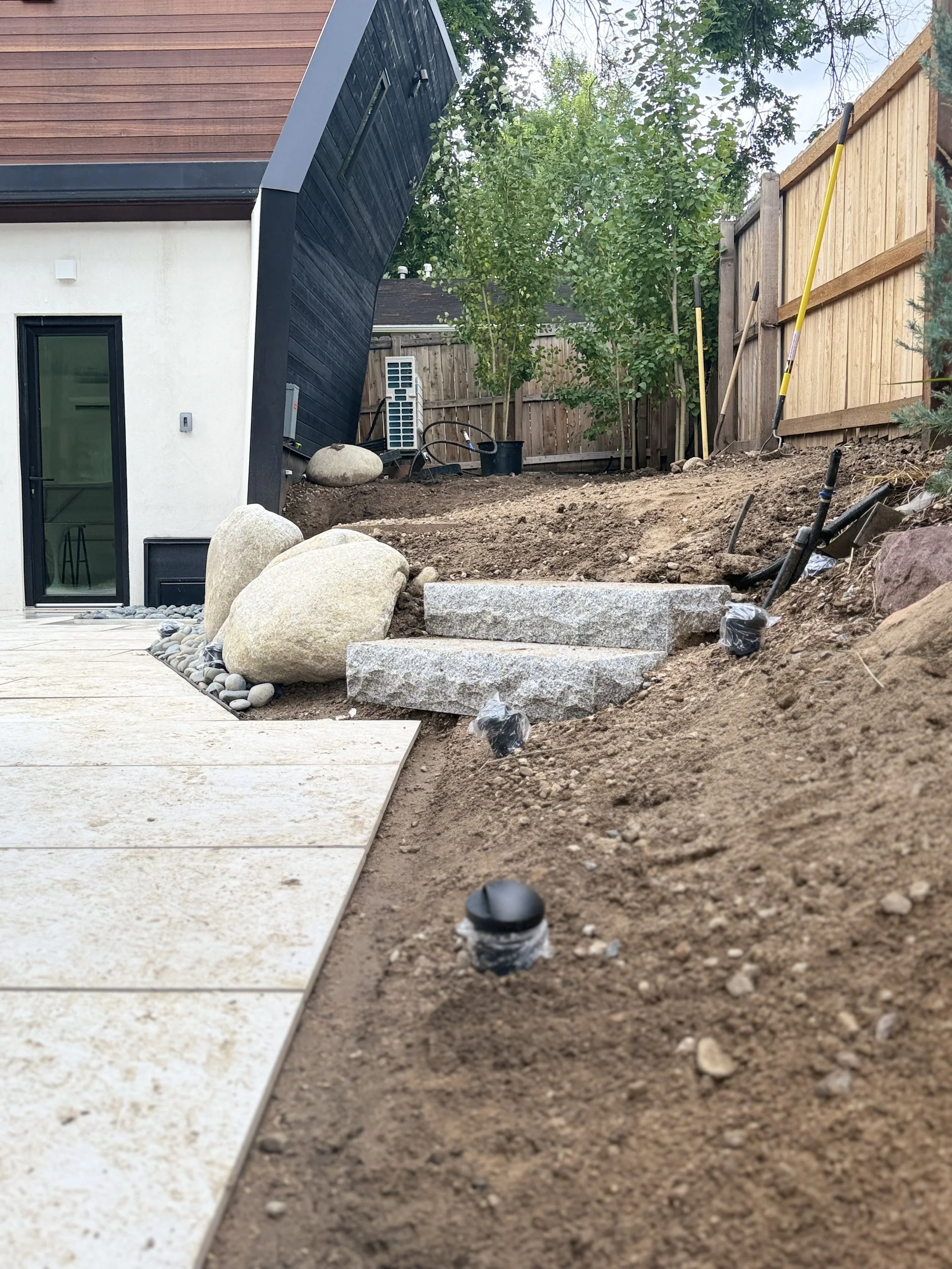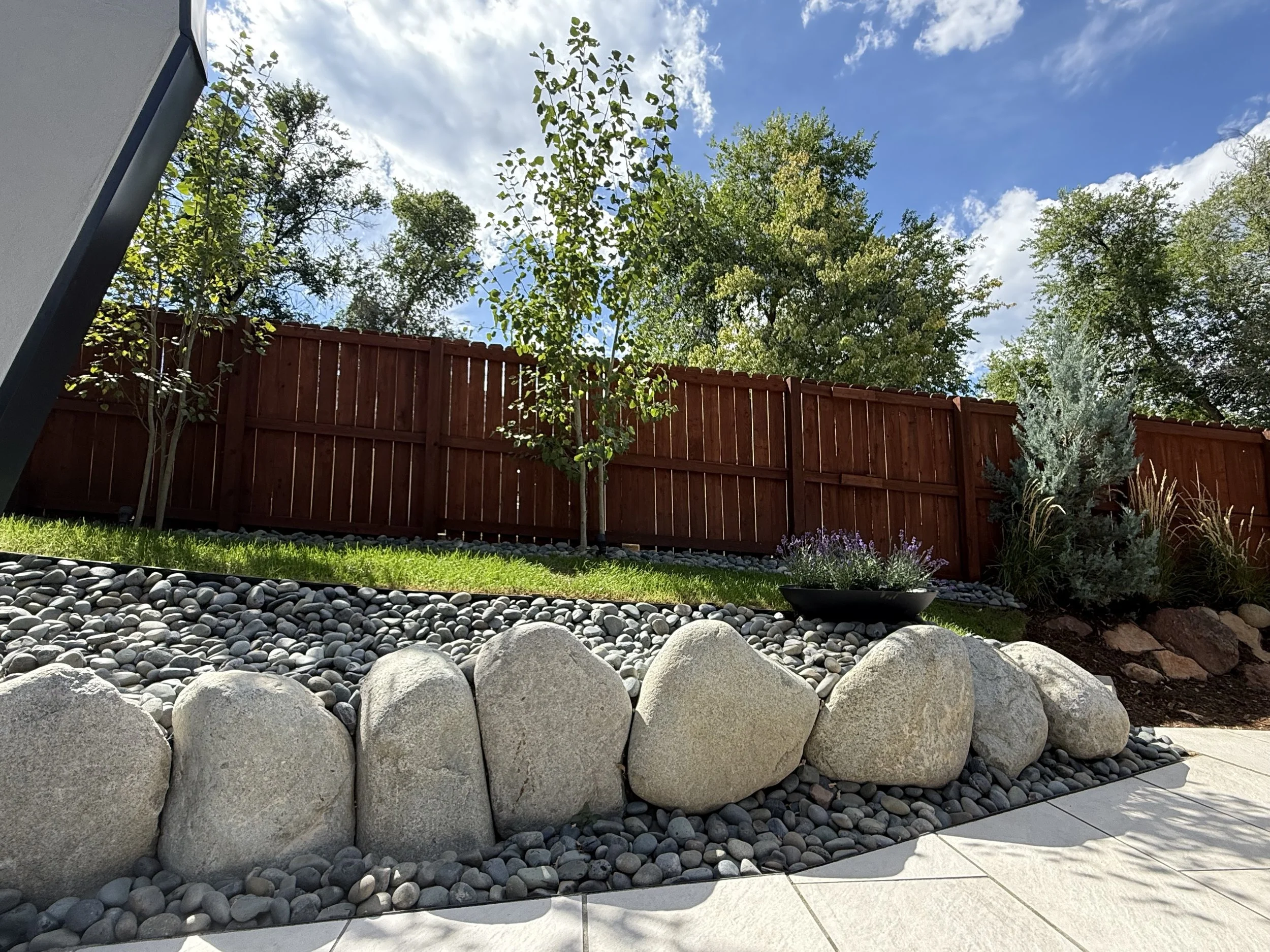There are so many processes involved in a design and these pictures capture part of the process: drainage, boulder selection, delivery, and placement, patio and lawn grading, paver installation, electrical prep for lighting, Mexican Beach Pebble placement, soil preparation, irrigation installation, plant selection then planting, custom fence installation, with the final step of placing the hot tub.