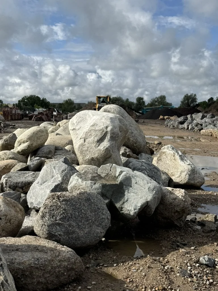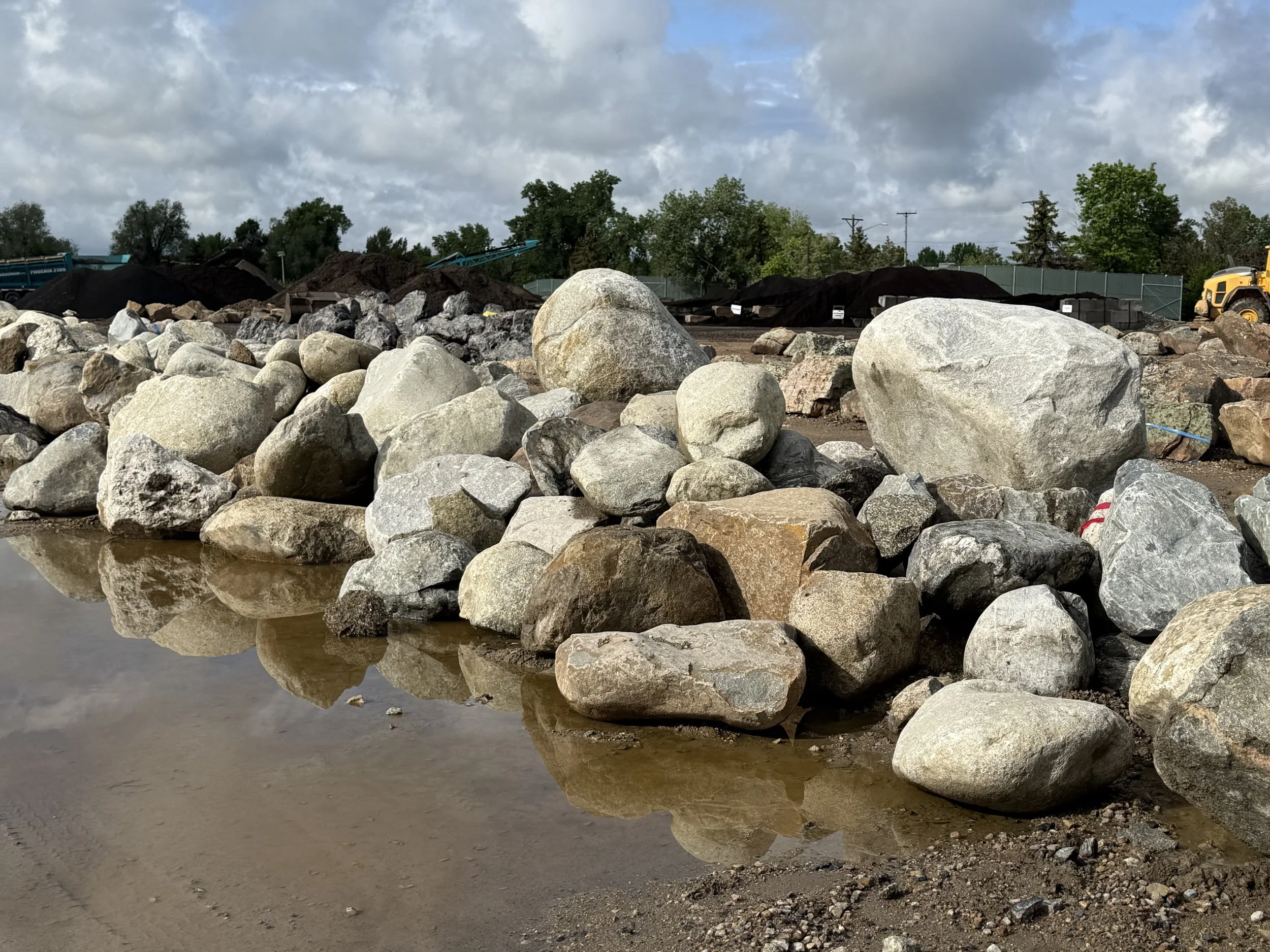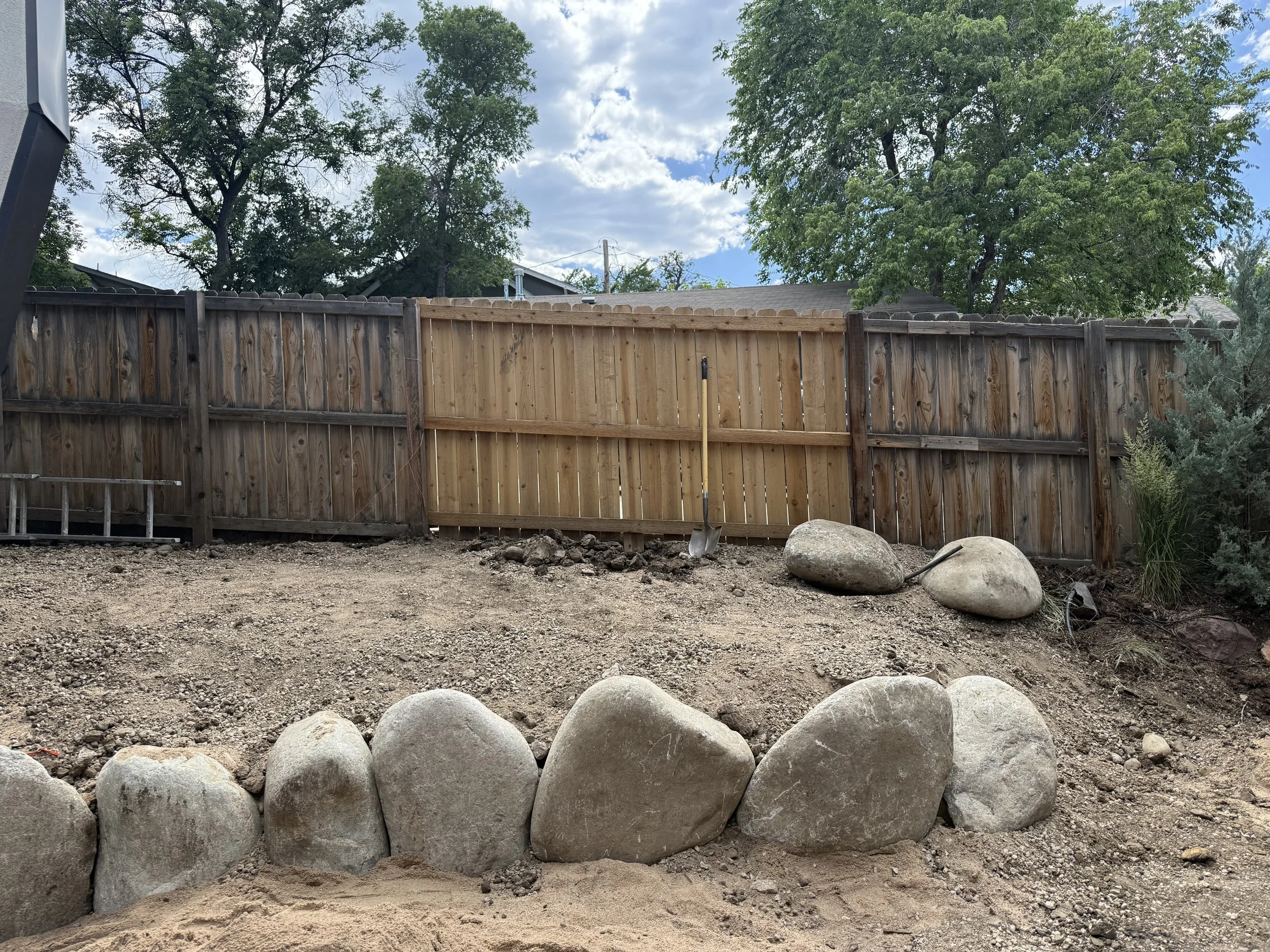 There are so many processes involved in a design and these pictures capture part of the process: drainage, boulder selection, delivery, and placement, patio and lawn grading, paver installation, electrical prep for lighting, Mexican Beach Pebble placement, soil preparation, irrigation installation, plant selection then planting, custom fence installation, with the final step of placing the hot tub.