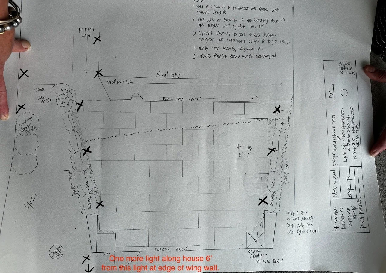 Putting all these pieces together, I presented the clients first with concept plans, sample products and finishes, and then we put a design program and master plan together. (See sketch). I connected the clients with the general contractor to complete the hardscape and lighting, the landscaper who would be doing the irrigation and softscape, the steel fabricator for the custom fence and screening panel to disguise mechanicals. I met separately with these contractors and facilitated communication and coordination among all of the moving parts of the project. The project began and it is still in process with an expected completion date of September 15, 2025.